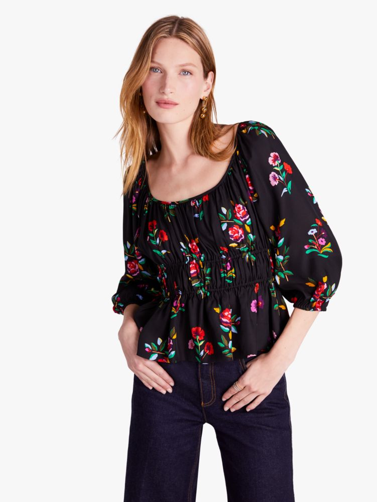 Kate Spade,Autumn Floral Long-sleeve Riviera Top,Viscose,Silk,Blouse,Ruched,Gathered Elastic Detail,Day Party,Black