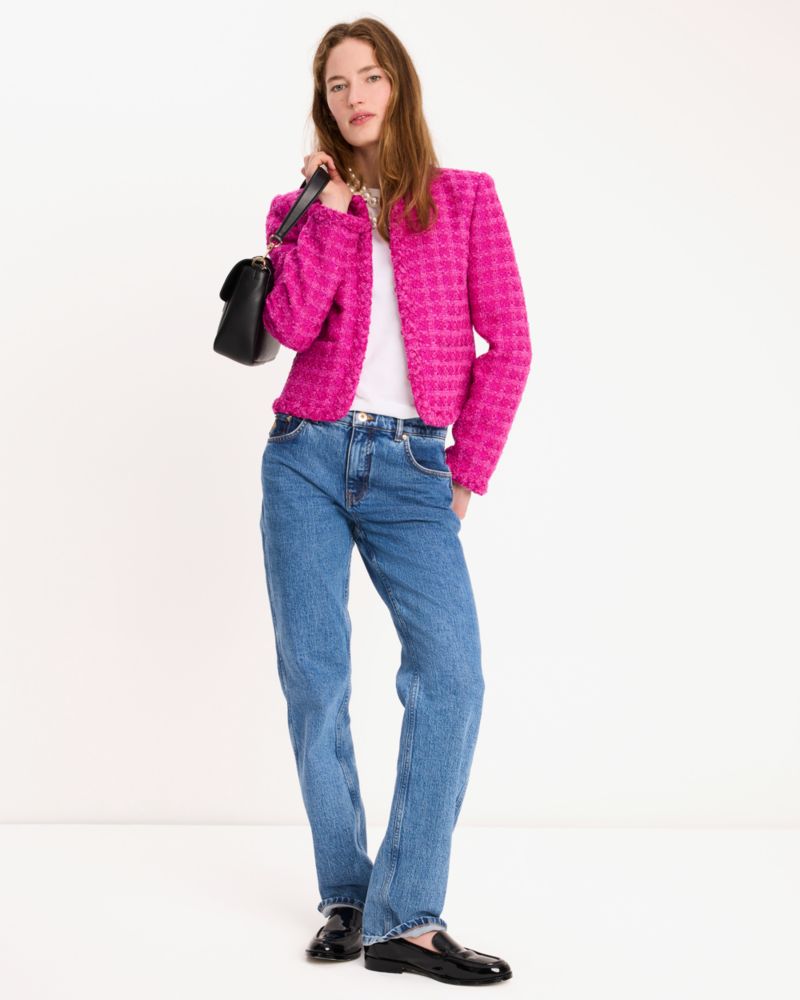 Channel old-school elegance with this collarless jacket in pink Cadillac tweed.