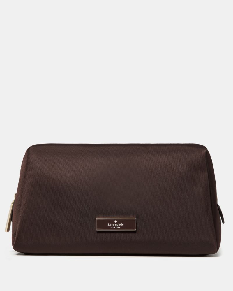 Kate Spade,Carter Nylon Cosmetic Pouch,Nylon,Makeup Bag,Metal,Logo,Gold Metal,Day Party,Travel,Brown