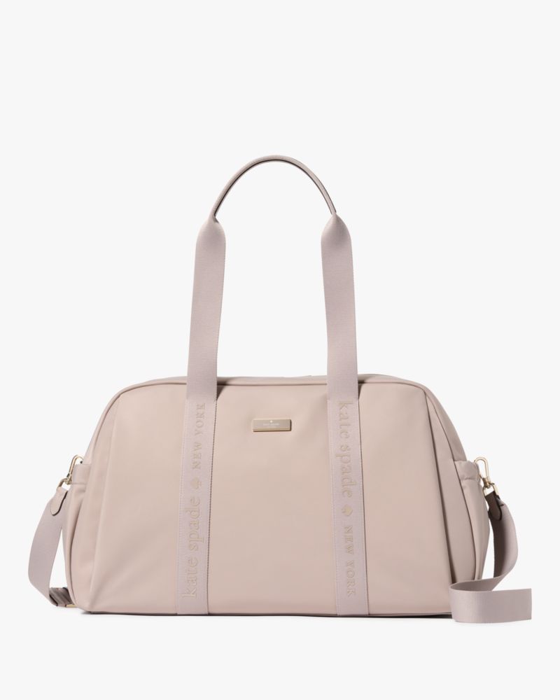 I ordered the Carter Nylon Large Weekender and had the hardest time choosing a color. The black was gorgeous, but I wanted something different, so I went with Lavender Smoke. It’s a light lavender, but rich and elegant in tone. The craftsmanship is absolutely beautiful — smooth, silky nylon, sturdy handles, and thoughtful details throughout. There are two elastic pockets on either end and, to my surprise, a hidden pocket along one side that’s perfect for a wallet, keys, or a passport. The inside lining is well made, the stitching is clean, and the interior pockets are smartly designed: one full‑length snap pocket, one open pocket, and a zip pocket on the back wall.