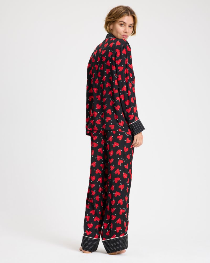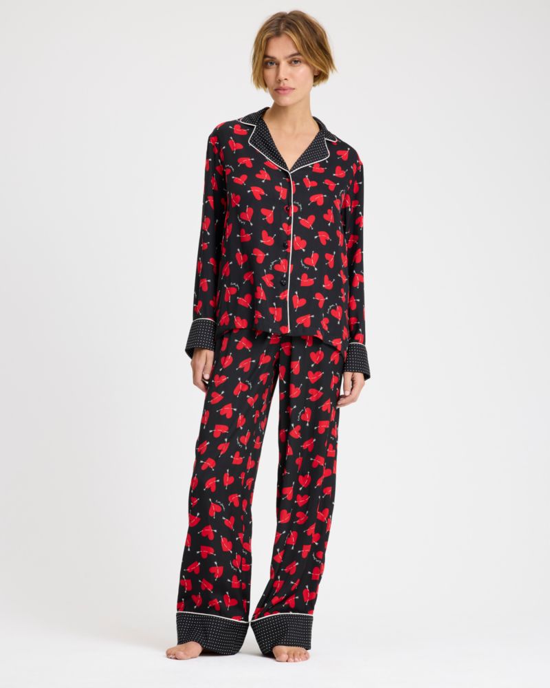 Kate Spade,Cupid Hearts Long Pj Set,Polyester,Straight,Wide Leg,Button Down,Piping,Pattern,All Season,Sleepwear,Black