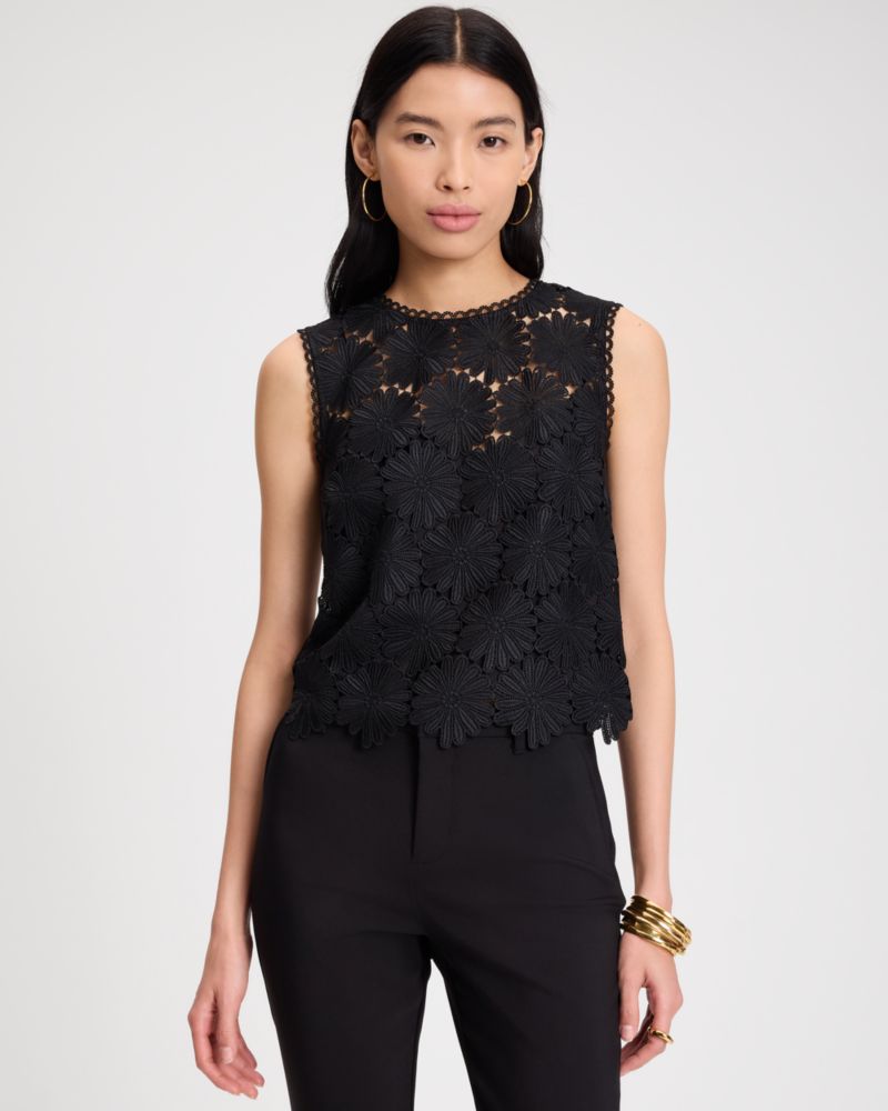 Kate Spade,Daisy Lace Shell,Polyester,Tank,Scallop,Sheer,Day Party,Black