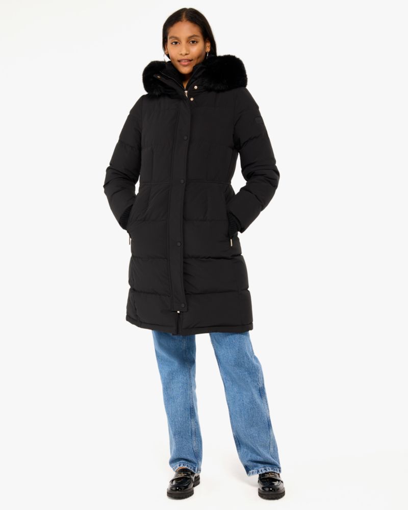 Sherpa lined and fox trimmed hood, zipped micro terry pockets