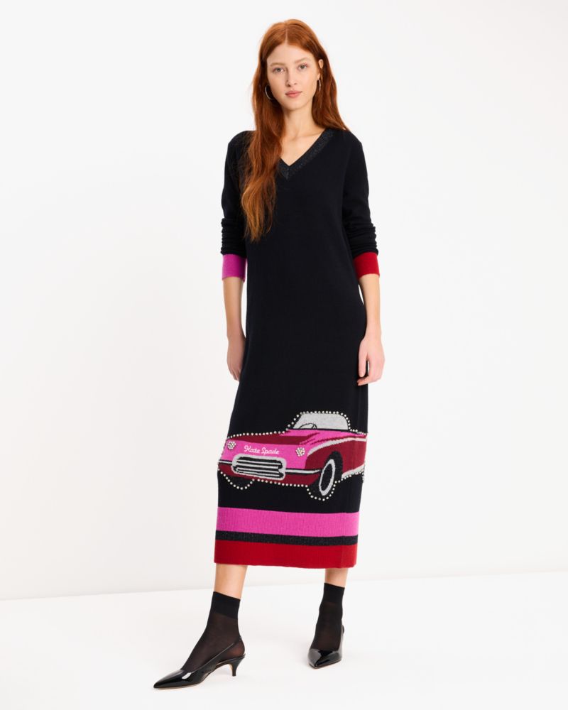 Va-va-vroom! This plush sweater dress features a rhinestone-embellished vintage car.