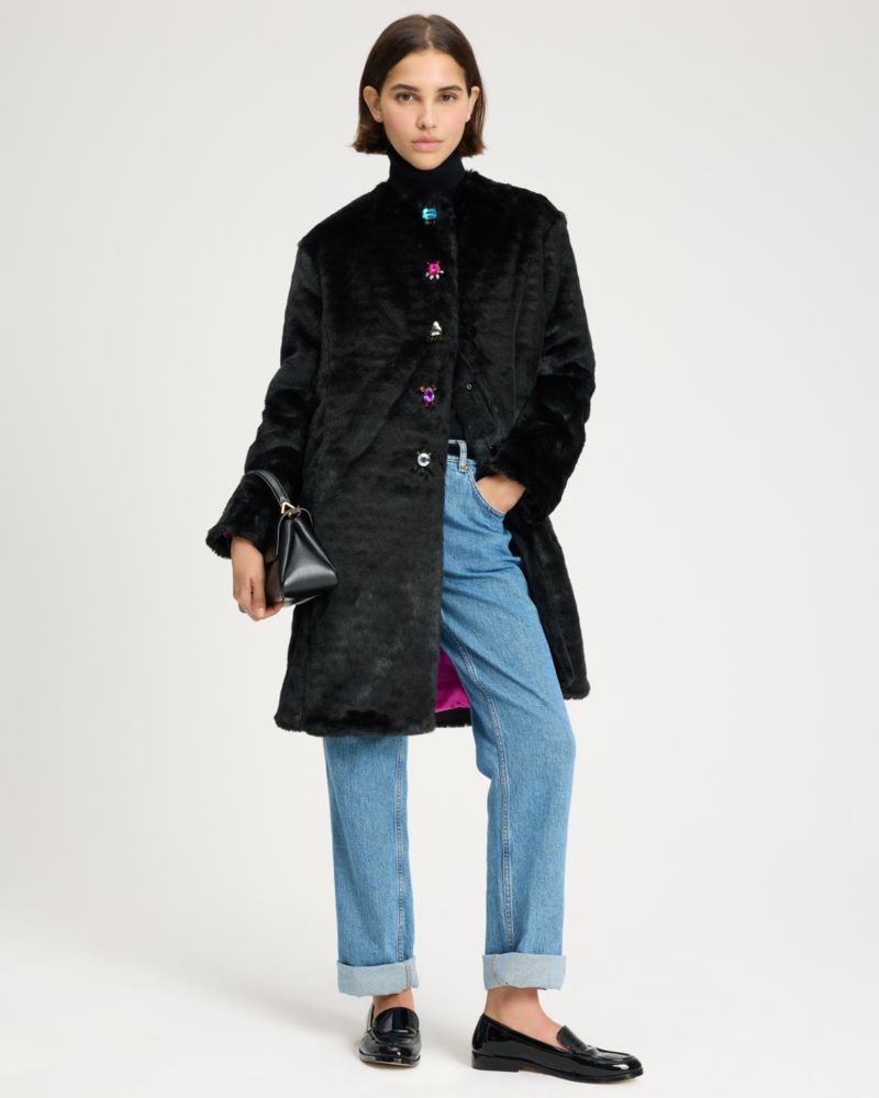Stay plush and pretty in our faux fur coat—it's embellished with crystal buttons for a fun pop of color.