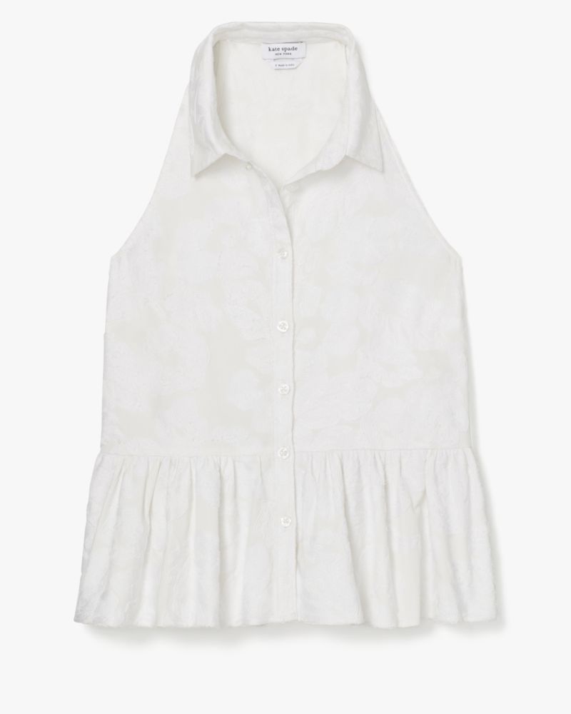 Hot days call for this pretty halter top made from our floral eyelet poplin.