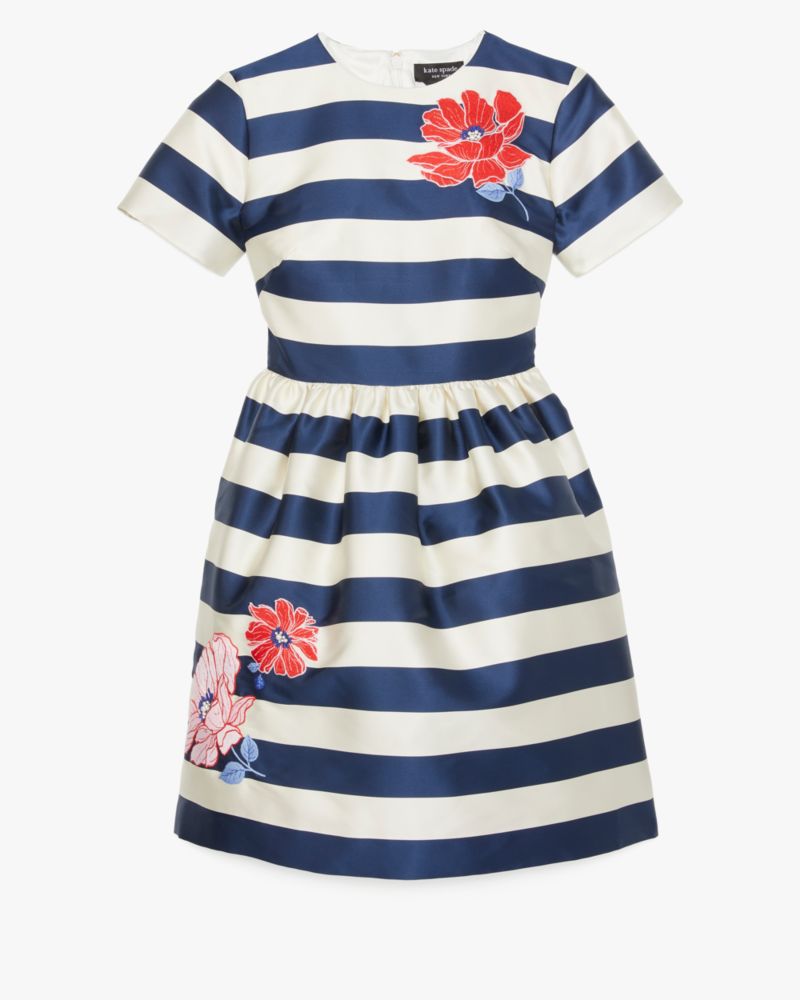 Love this dress so much! I was hesitant about getting the dress as we have all been told that horizontal stripes always make you look wider. That is not the case with this dress. It is a great fit in the arms and everywhere. I an 5'6" and this dress hits me just at the knee in size 12. Slightly large but not enough for me to exchange it. I did end up going to my tailor and having a few inches of fabric taken off from around the very full skirt. It had a little too much of the inverted cupcake look with all the fabric and pleats at the bottom. All in all, a solid dress that I am planning on being a normal everyday and work attire.