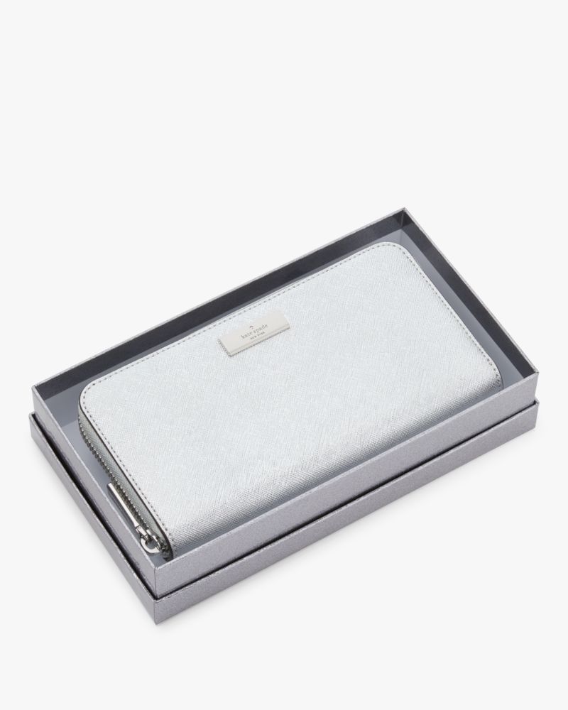 Not only does this large wallet have multiple card slots, billfold compartments and zip pockets at the interior, it has a very pretty exterior. In this case, we think more is more.