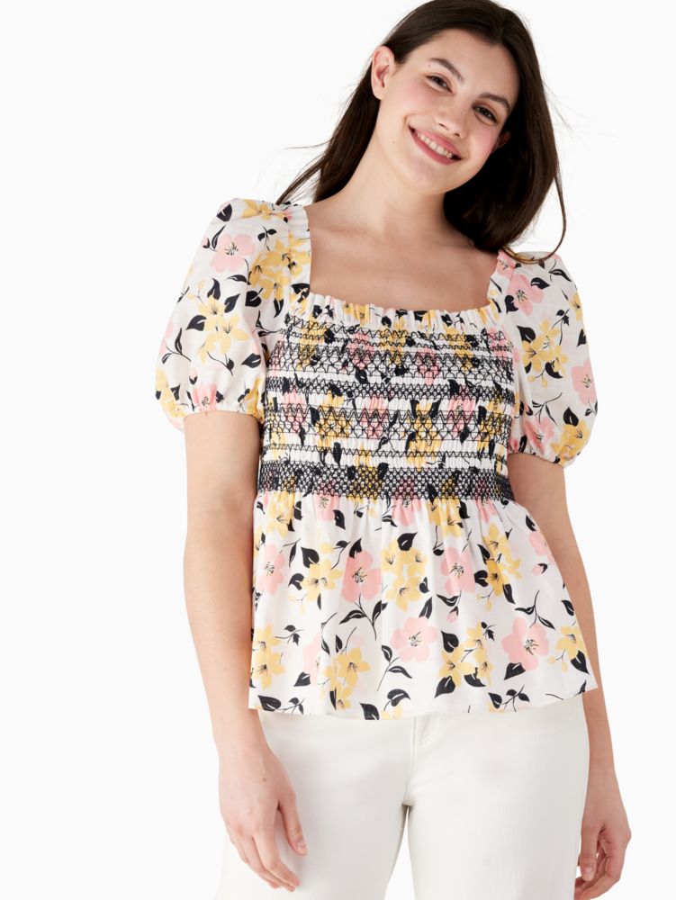 Kate Spade,Lily Blooms Puff-sleeve Top,Cotton,Blouse,Embroidered,Frills,Shirring,Lined,Day Party,White