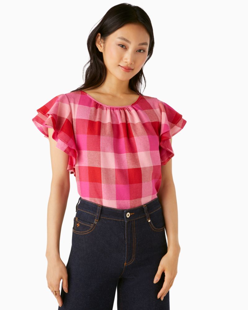 Kate Spade,Picnic Woven Flutter-sleeve Top,Linen,Rayon,Blouse,Layered,Ruched,Day Party,Multi Color