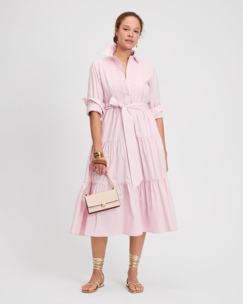 Have a spring fling in this tiered poplin shirt dress with elegant pintuck accents.