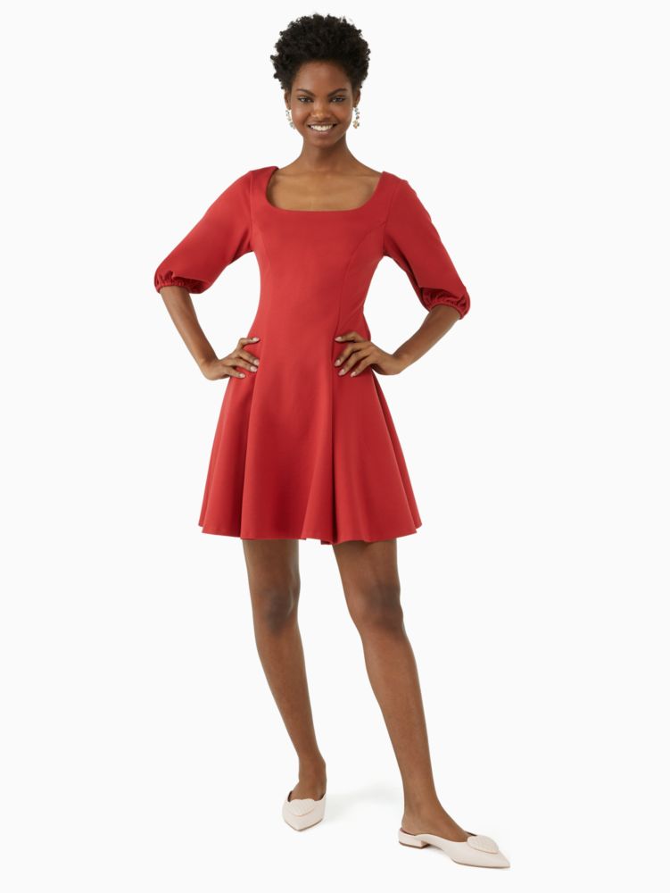 The color of this dress is amazing! I love everything about the dress from the sleeve length, skirt length, to scoop neck. It's very comfortable and fits true to size. Great for a date night.