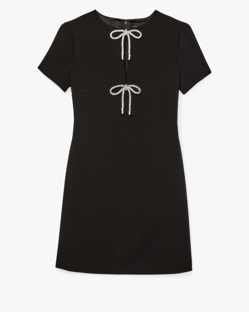 Tailored in smooth double crepe, this classic mini dress is embellished with sparkling rhinestone bows along the front.