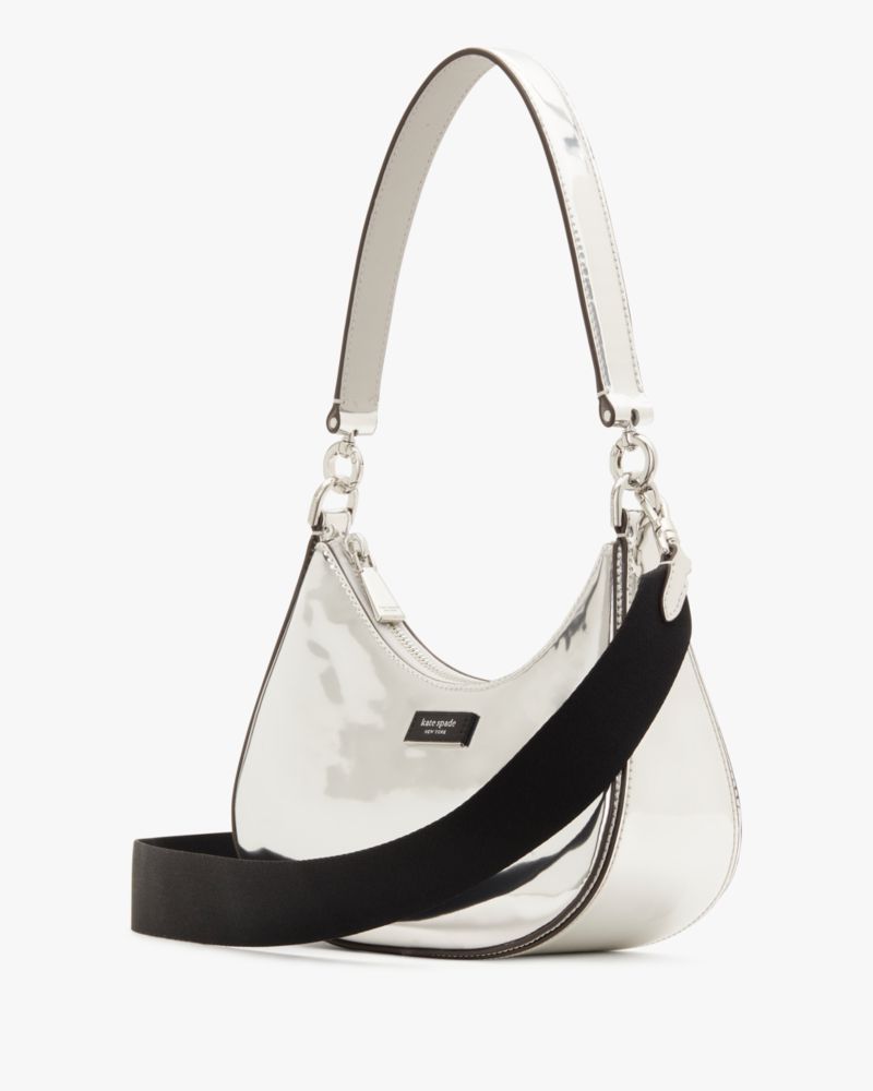 Kate Spade,Sam Icon Metallic Small Convertible Crossbody,Leather,Shoulder Bag,Logo,Adjustable,Silver Metal,Day Party,White