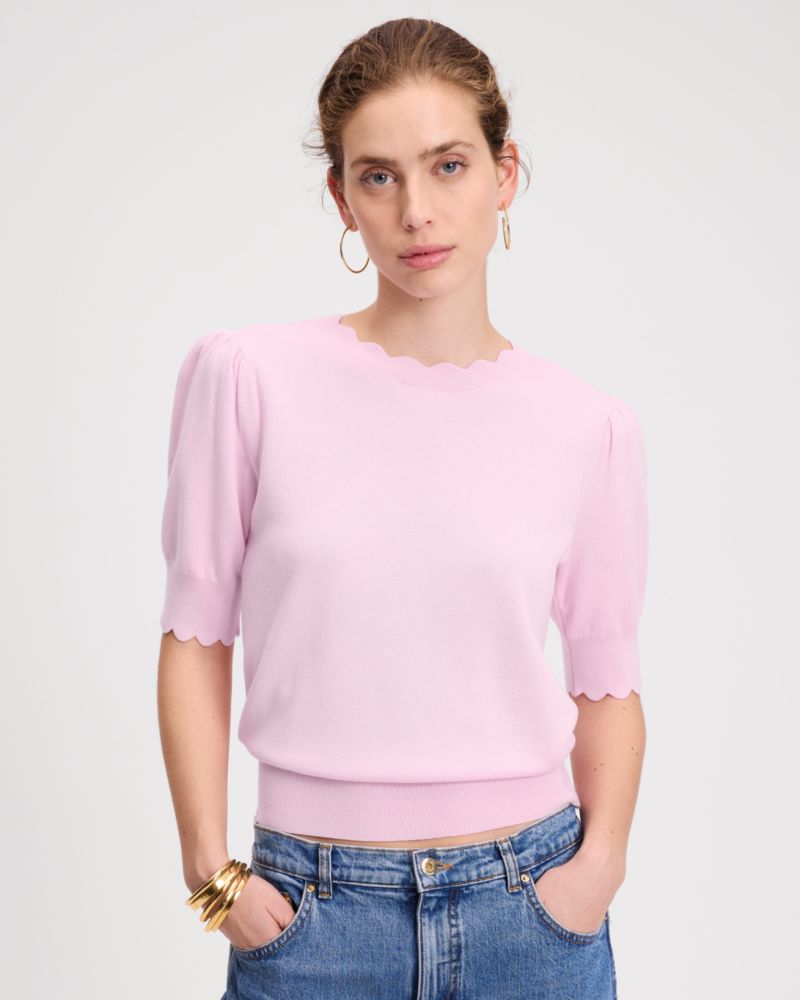 Scalloped along the neck and cuffs, this short-sleeve sweater is made from a soft silk-blend knit in our bright Pink Lemonade hue.