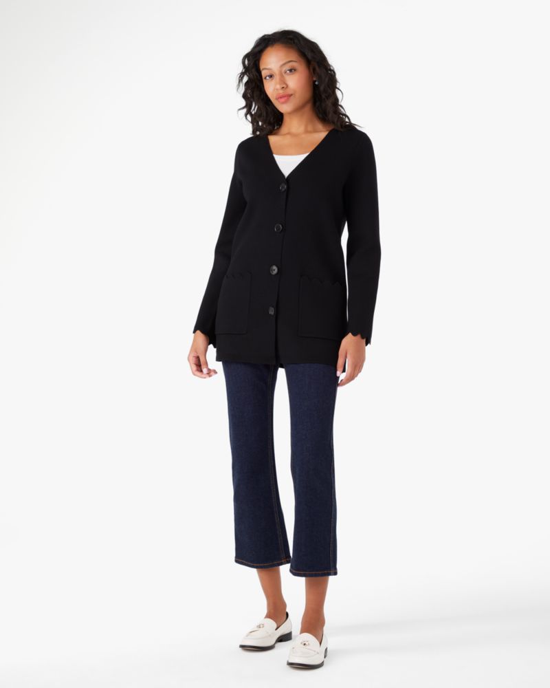 After purchasing this, I had a little regret because of my height. I took a second look and thought, with the scalloped wrist hem there’s no way it’s going to work for me. But to my surprise, the fabric is structured and very nice. I did one big cuff, which still shows the scalloped edge, and it looks sleek and sophisticated. If you’re worried about the arm length, don’t be, it folds beautifully, almost as if it was designed to be cuffed, and the scalloped detail adds so much charm. This is a medium-weight sweater. It runs true to size, shows off your figure without clinging, and the thicker fabric hides flaws. I’d recommend ordering your true size; there’s even room underneath for a shirt. I originally wanted it in black, but my size was sold out, so I went with the camel, and it’s absolutely gorgeous. I would definitely get the black too if it comes back in stock. Perfect for fall and winter. Last night, I needed to go somewhere nice. I was wearing flare-style yoga pants with pockets (that look like work pants) and a black scoop-neck tank top. I didn’t feel like changing, so I threw on ankle boots, this sweater, and a necklace. I kid you not, I looked totally put together and dressed to impress. The sweater elevated everything. My husband loved the outfit; he even thought I bought new pants and had no idea they were yoga pants. It was great, I was comfortable all night, and nobody in a million years could’ve guessed, because the sweater is just that nice. Get it while you can, this is a forever staple piece for your wardrobe