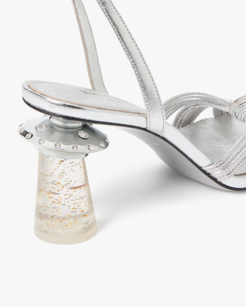 Out of this world! Our new Spaced Out sandals are crafted from high-shine metallic leather with clear UFO-embellished heels.