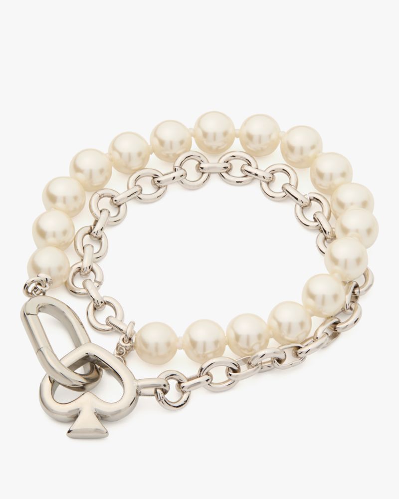 Kate Spade,Statement Spade Pearl Wrap Bracelet,Glass,Gemstone,Cubic Zirconia,Pearl,Logo,Pearl,Brass,Stainless Steel,Day Party,Cream