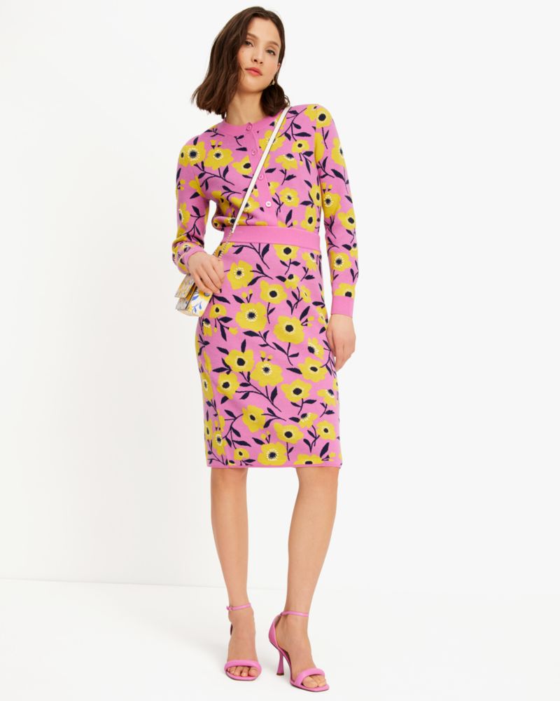 Now in season: this polished pencil skirt in our Sunshine Floral print knit. It's embellished with delicate beads for a subtle hint of shimmer.