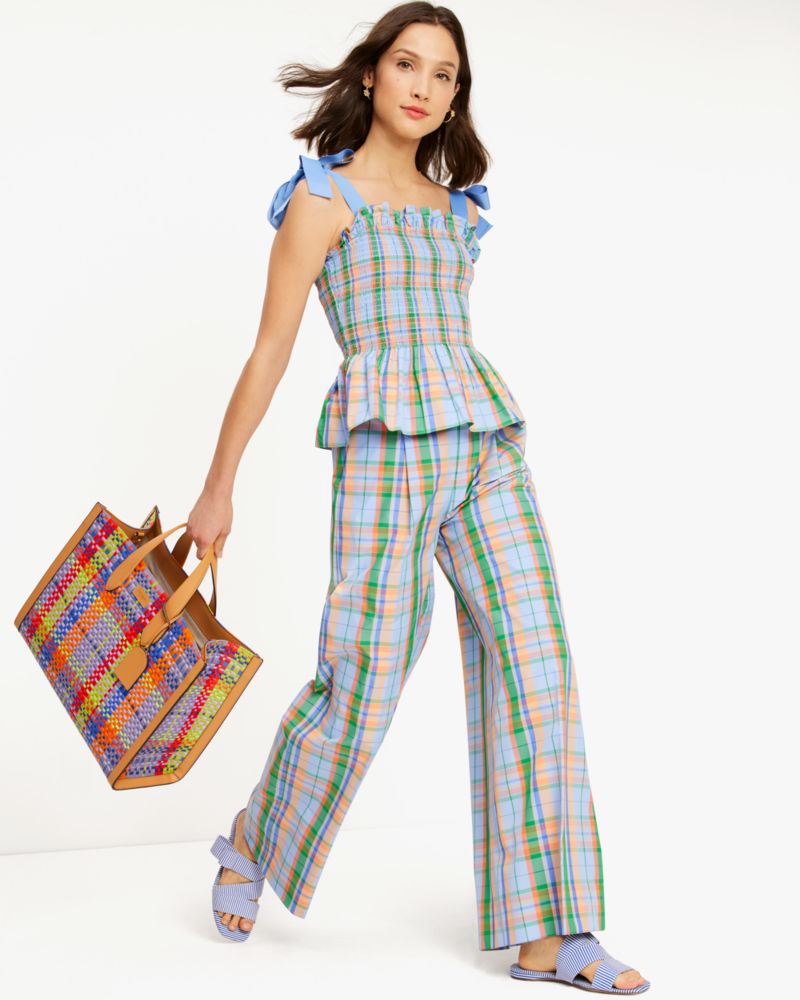 Add a fun pop of color to your springtime wardrobe. This smocked top is done in our Sunshine Madras print taffeta and finished with pretty shoulder ties.