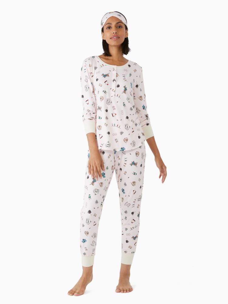 Kate Spade,Henley Holiday Pajama Set,Polyester,Spandex,Henley,Eye Mask,Jogger,Piping,Set,Sleepwear,White