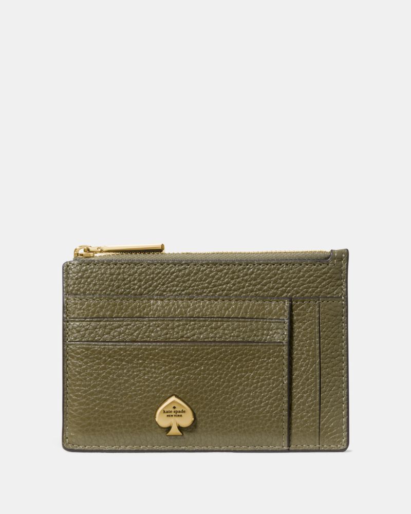 Kate Spade,Kayla Large Slim Cardholder,Calfskin Leather,Coin,Card Case,Metal,Logo,Casual,Olive