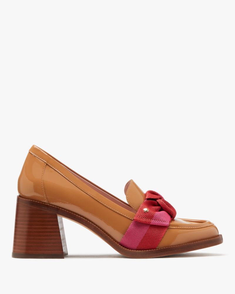 Kate Spade,Leandra Heeled Loafer,Lining Leather,Leather,Pumps,Loafer,Logo,Metal,Bow,Stripe,Gold Metal,Day Party,Brown