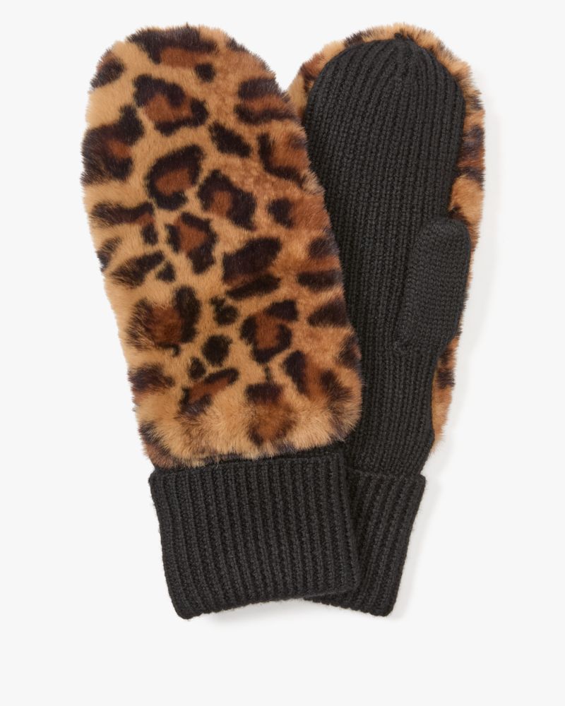 Kate Spade,Leopard Faux Fur Mittens,Polyester,Mittens,Fur Embellishment,Casual,Multi Color